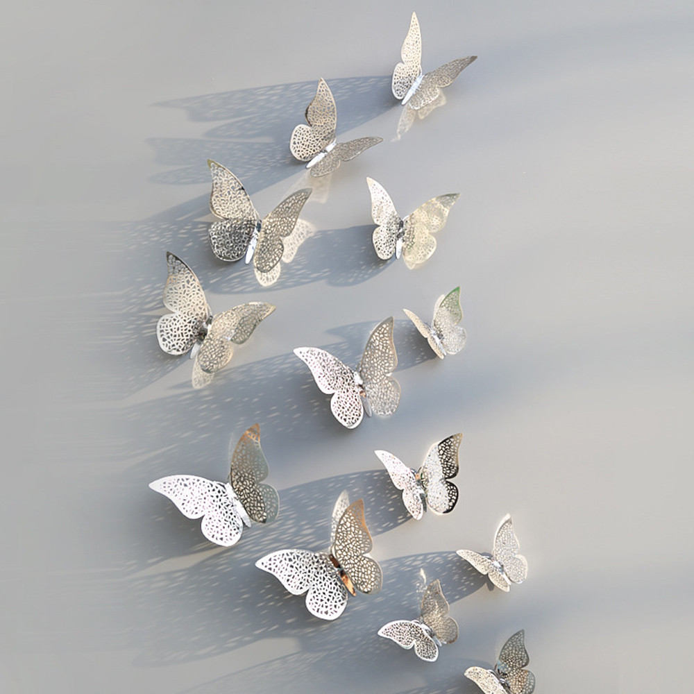12 kusů motýlků vyrobených z tenkého, zdravotně nezávadného plastu lesklé stříbrné barvy. Motýlci mají krásný zrcadlový a krajkovaný efekt. S motýlkami docílití krásné dekorace v ložnici, obývaku, v chodbě u zrcadla atd.