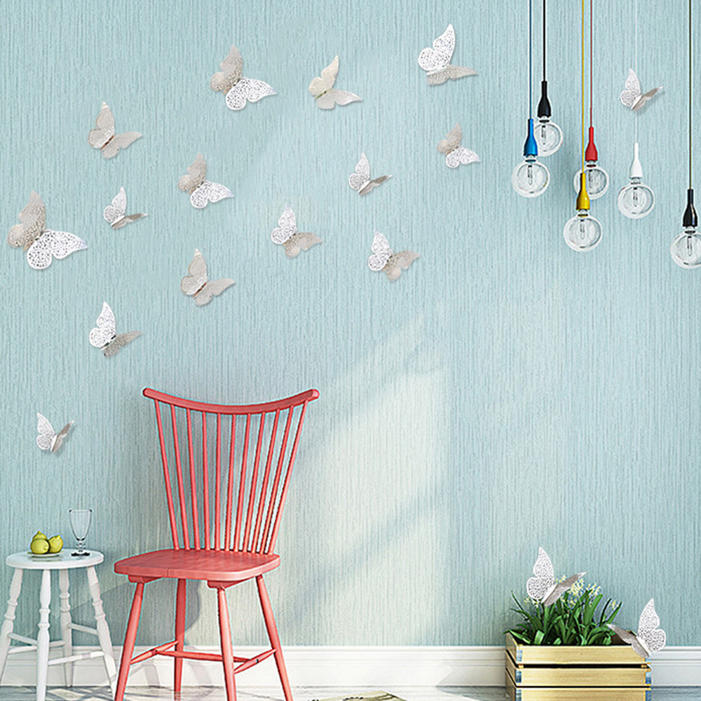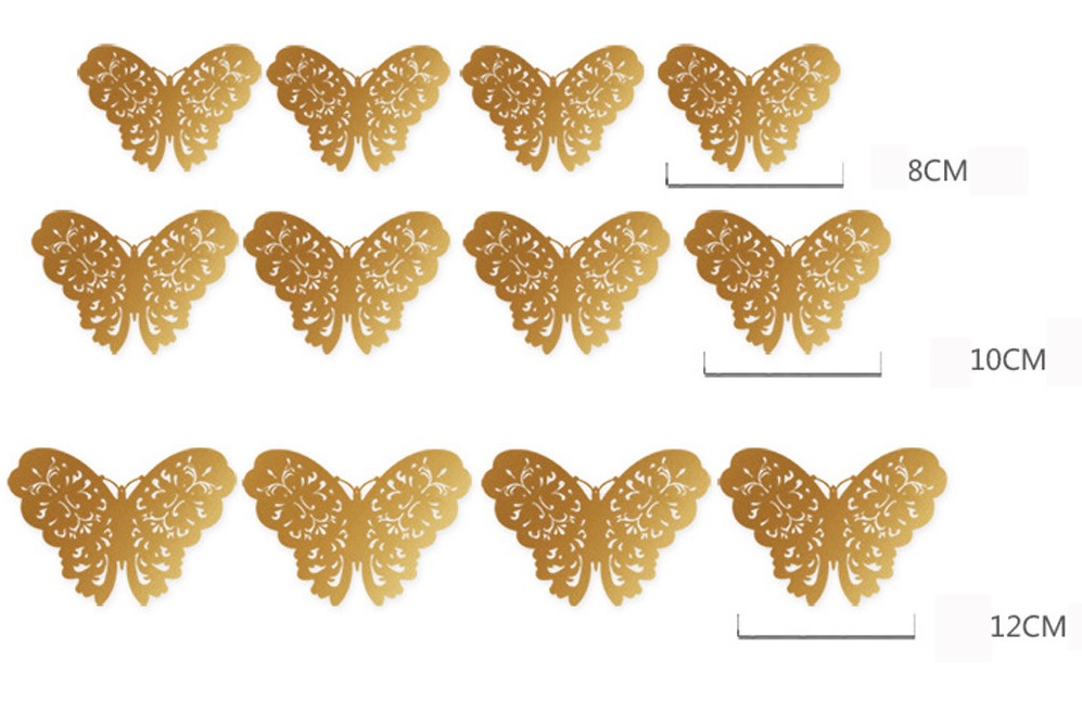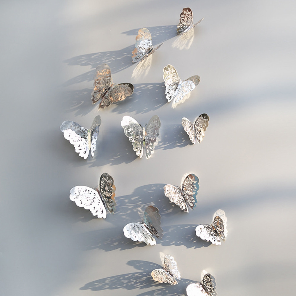12 kusů motýlků vyrobených z tenkého, zdravotně nezávadného plastu lesklé stříbrné barvy. Motýlci mají krásný zrcadlový a krajkovaný efekt. S motýlkami docílití krásné dekorace v ložnici, obývaku, v chodbě u zrcadla atd.