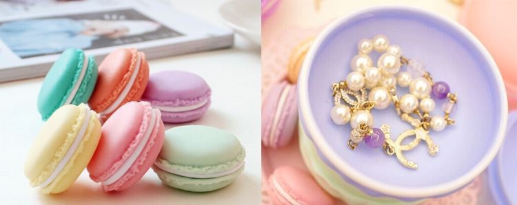 Makronky drobný sladký dezer z Francie, který si získal celosvětovou oblibu, a nyní je můžete mít jako šperkovnice na Vaše drobnosti. Makronky jsou velmi propracované, a na Vaše stole, koupelně, v ložinici krásně vyniknou. Zvolte si barvu makronky, růžovou na prstýnky, modrou na náušničky. Makronky jsou téměř identicke jako ty pravé, jsou skvělým designovým doplňkem na Vaše šperky.