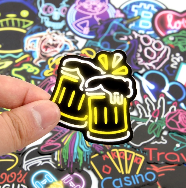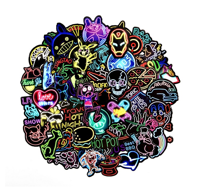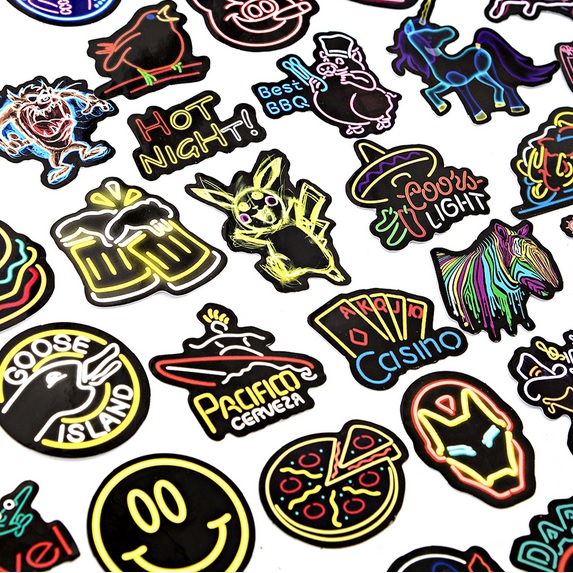 Super barevné neonové samolepky různých motivů na všechny možné povrchy. Samolepky jsou velice kvalitní a voděodolné. Samolepky jsou v různém provedení a stylu. Prostě si polepte co chcete. Skateboard, snowboard, kolo, helmu, kufr, notebook, auto atd. možnosti jsou neomezené! Samolepky dodáváme v balení po 30 kusech.