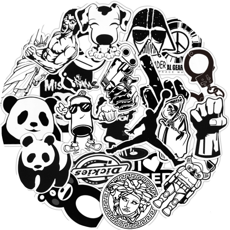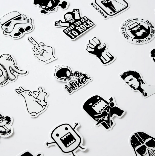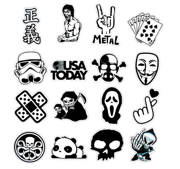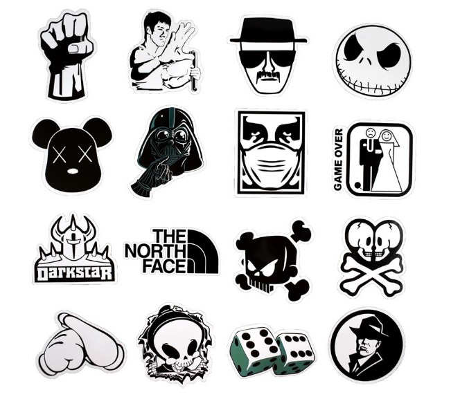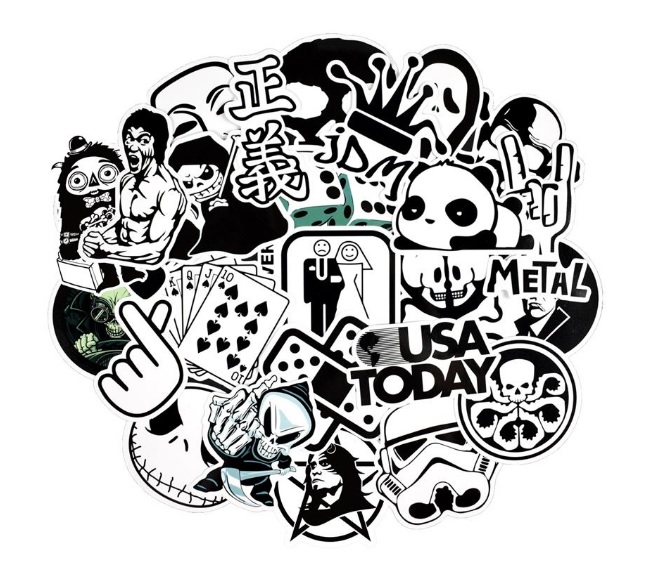 COOL černobílé samolepky na všechny možné povrchy. Samolepky jsou velice kvalitní a voděodolné. Samolepky jsou v různém provedení a stylu v černobílých barvách. Prostě si polepte co chcete. Skateboard, snowboard, kolo, helmu, kufr, notebook, auto atd. možnosti jsou neomezené! Samolepky dodáváme v balení po 50 kusech.