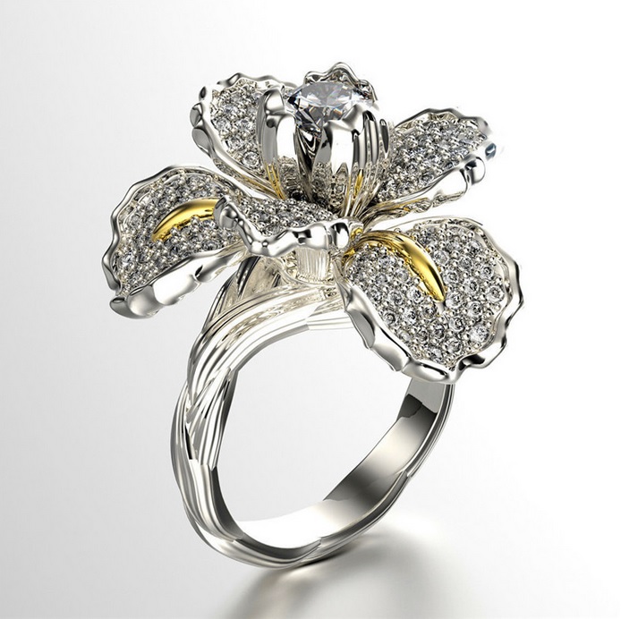 Půvabný dámský prstýnek zdobený třpytivými zirkony. Prstýnek je ve tvaru kytičky, která je dekorovaná mnoha kamínky. Vzhled prstenu je zajímavý svým provedením a je velmi hezký. Krásně vynikne na dámské ruce. Povrchová úprava je stříbro. Zirkon je průhledný až průsvitný minerál krásného lesku. Jako takový je oblíbený na celém světě a hlavně ve šperkařství.