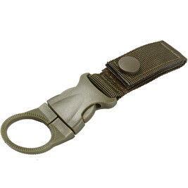 Hliníkový závěsný držák na láhve s karabinou. Ideální pomocník šetřící místo ve Vašem batohu a láhev máte vždy při ruce. Čelisti držáku nacvaknete na hrdlo PET lahve a pomocí karabiny ji můžete zavěsit na batoh nebo třeba na kalhoty apod. Karabina s čelistmi jsou spojeny pevným nylonovým popruhem, nemusíte se tak bát, že příjdete o Vaši láhev.