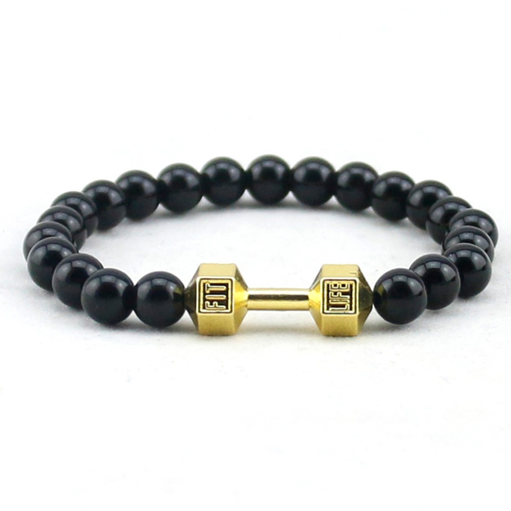 Náramek z kvalitních přírodních materiálů, tentokrát z černých lesklých lávových kamenů doplněn zlatou činkou s nápisem FIT. Náramek Vám přinese pozitivní energii do života, vhodné pro všechny, kteří milují sport. Tento náramek je velmi oblíbený svojí originalitou a designem.