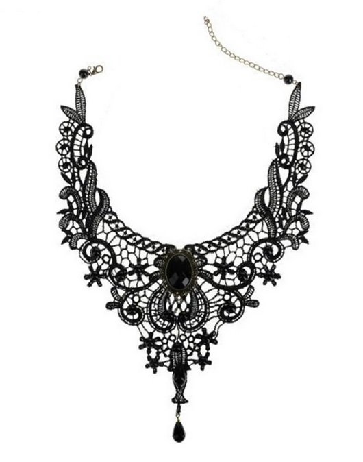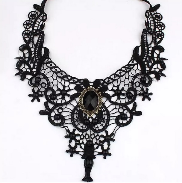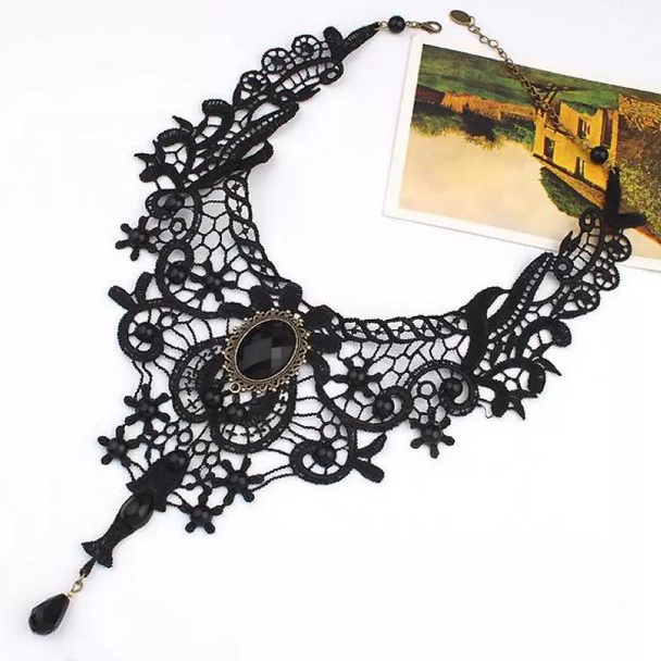 Krajkový náhrdelník černé barvy s černým kamenem , který krásně vynikne nejen na opáleném tělě. Velmi hezký doplněk k Vaším šatům ať už na ples, zábavu, oslavu či svatbu. Ozdobte Váš krásný krk tímto hezkým sexy doplňkem.
