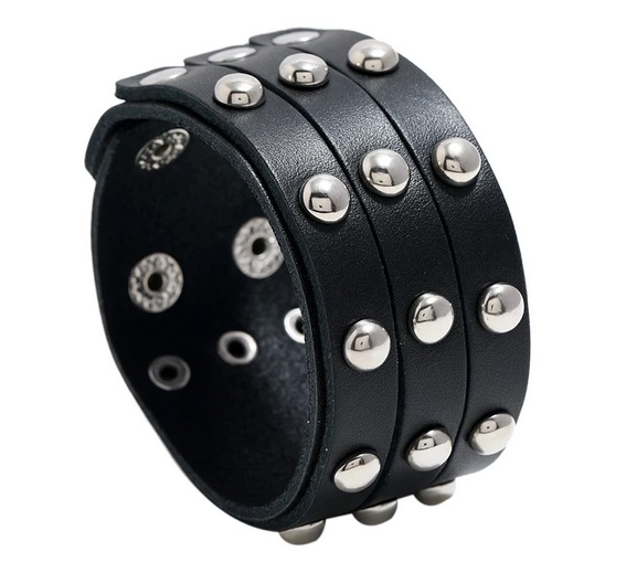 Rockový, punkový, kožený náramek pro každodenní nošení. Módní unisex náramek černé barvy z pravé kůže určený nejen pro rockové duše. Po jeho obvodu jsou nasázeny stříbrné cvoky z nerezové oceli a to z něj dělá opravdu cool kožený náramek na Vašem zápěstí. Náramek se zapíná cvočky a zapnout jej lze na tři různé velikosti.