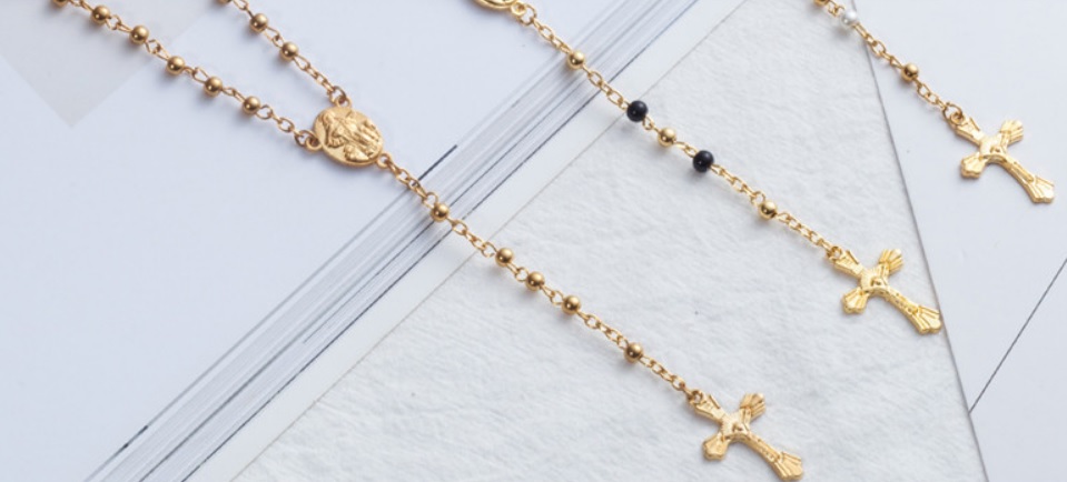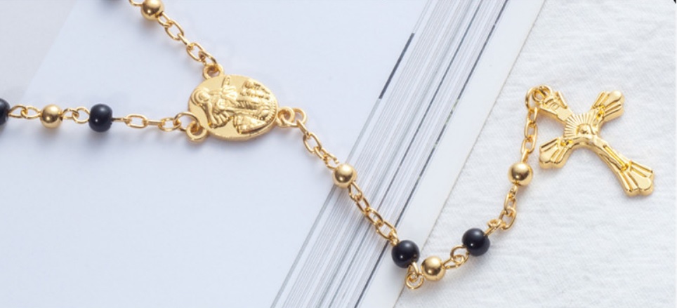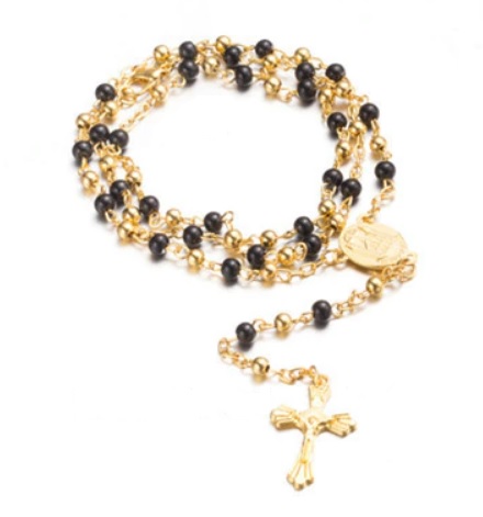 Velmi pěkný růženec v kombinaci zlaté a černé barvy, který se hodí nejen do auta na zrcátko, ale i na krk, ruku, či jako ozdoba domova. Růženec obsahuje křížek zlaté barvy a panenku Marii. Jednoduché zapínání pomocí karabinky. Původ růžence jako modlitebního počítadla je raně středověkého původu.