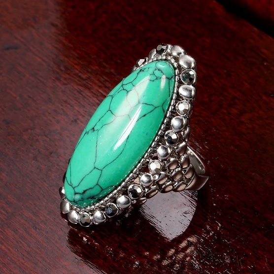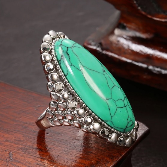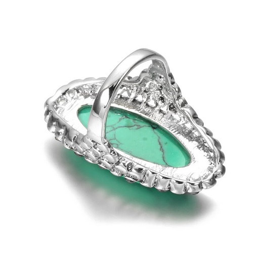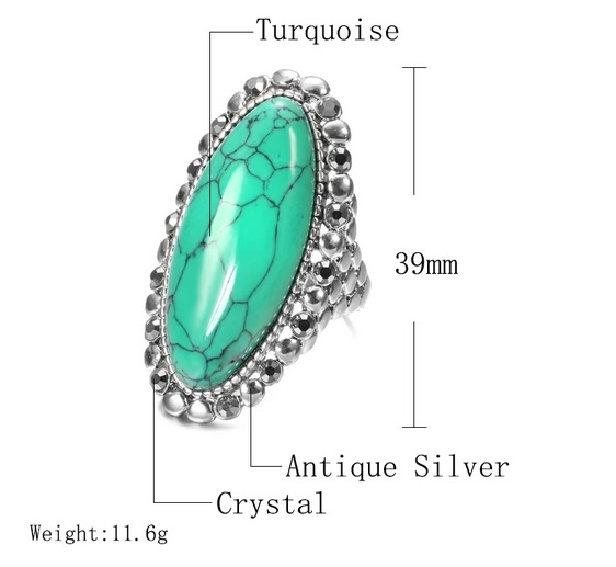 Půvabný dámský prsten zdobený tyrkysem. Prstýnek je z vrchu dekorován velkým tyrkysem. Vzhled prstenu je zajímavý svým provedením. Tento stylový prsten se hodí pro všechny příložitosti a stane se Vašim oblíbeným doplňkem k Vašemu outfitu. Tyrkys je nejúčinnější léčivý krystal. Přináší zotavení ducha i pohodu těla. Jedná se o ochranný kámen používaný od nepaměti na amulety. Povrchová úprava je antické stříbro.