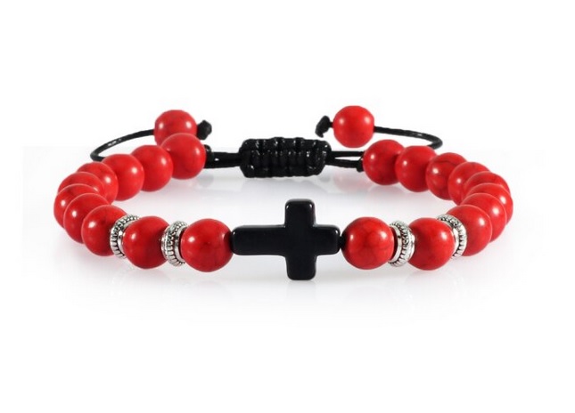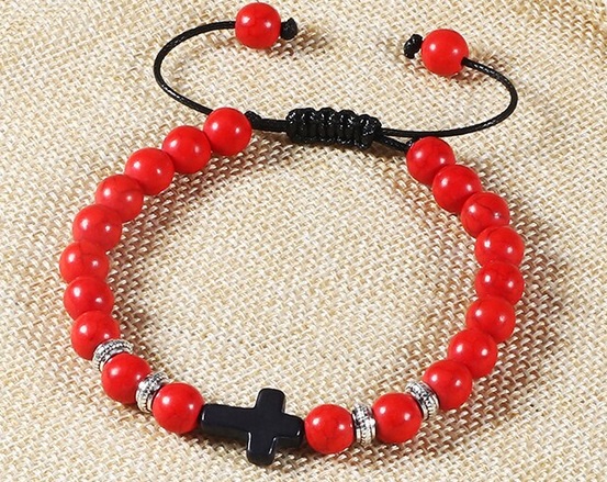 Originální, ručně vyrobený náramek z přírodního kamene – červený kámen, doplněný černým křížkem. Tento stylový náramek se hodí pro všechny a velmi brzy se stane Vašim oblíbeným doplňkem. Červený kámen (také se mu říká krvavý) je velmi oblíbený k výrobě amuletů, slouží k ochraně zdraví a člověka. Nárámky vyrobeny z tohoto materiálu vypadají krásně. Jedná se o ochranný kámen. Korálky jsou navlečeny na pleteném stahovatelném provázku.