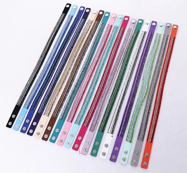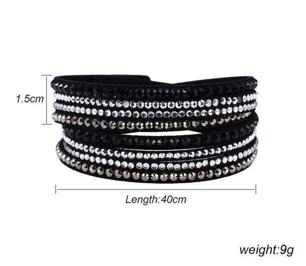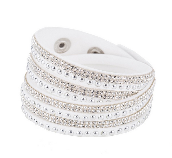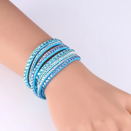 Velmi hezký dámský kožený náramek na ruku zdobený lesklými kamínky. Tento stylový náramek se hodí pro všechny příložitosti a stane se Vašim oblíbeným doplňkem k Vašemu outfitu. Náramek je vyrobený z barvené kůže, pestře zdobený kamínky a zapínáním na cvoky. Náramek jednoduše omotáte okolo zápěstí a můžete vyrazit. Velmi příjemně se nosí a ještě lépe vypadá.