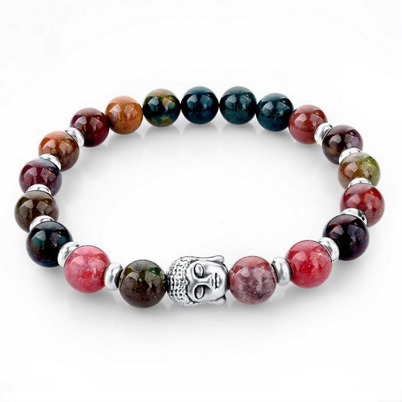 Náramek z přírodního kamene, zdobený hlavou buddhy. Náramek se stane Vašim oblíbeným módním doplňkem a přinese Vám pozitivní energii do života. Tento stylový náramek se hodí pro všechny příložitosti a stane se Vašim oblíbeným doplňkem k Vašemu outfitu. Jedná se o ochranný kámen používaný odnepaměti na amulety. Buddhovy náramky dotváří vždy ozdobný korálek v podobě zosobnělého Buddhy, který je vyroben z kvalitního kovu a zaručuje odolnost vůči vnějším vlivům. Korálky jsou navlečeny na dvojté velmi pevné a odolné pryžové gumičce.