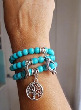Originální, ručně vyrobený náramek z přírodního kamene – tyrkysu, doplněn přívěskem z nerezové oceli. Tento stylový náramek se hodí pro všechny příložitosti a stane se Vašim oblíbeným doplňkem k Vašemu outfitu. Tyrkys je nejúčinnější léčivý krystal. Přináší zotavení ducha i pohodu těla. Jedná se o ochranný kámen používaný odnepaměti na amulety. Korálky jsou navlečeny na dvojté velmi pevné a odolné pryžové gumičce.