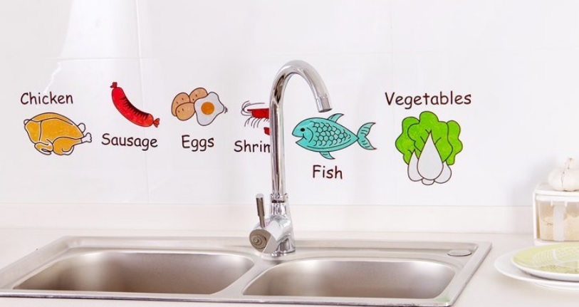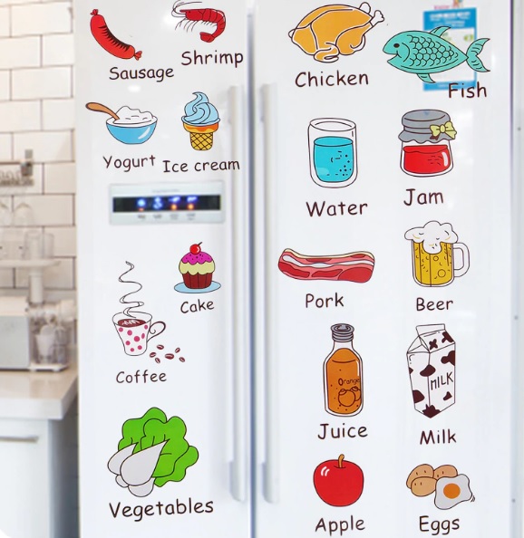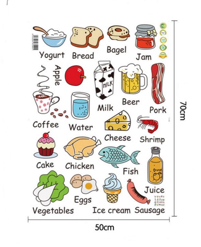 Samolepka oblíbených potravin do Vaší kuchyně. Samolepka obsahuje několik druhů potravit, které jsou popsané v angličtině. Velmi pěkné provedení potravin dodají vašim stěnám a spotřebičům ten pravý šmrnc a svěžest. Samolepka je vhodná na všechny povrchy.