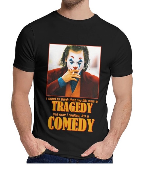 Pánské stylové tričko Joker/Tragedy comedy, na motivy úspěšného filmu Joker. Kdo by neznal klauna, úhlavního nepřítele batmana. Pro Všechny milovníky tohoto cool filmu. Další skvělý kousek do Vašeho šatníku. Tričko má velmi kvalitní a stylový potisk, velmi dobře padne a je vyrobené ze 100% bavlny. S tímto tričkem budete vypadat skvěle.
