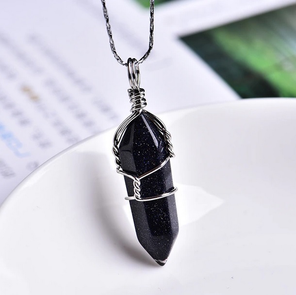 Krásný přívěsek na krk s drahokamem (modrý písečný kámen). Tento přívěsek dodá Vašemu outfitu ten správný šmrnc. Jedná se vzácný kámen, který je uchycen a navlečen na nerezový řetízek s karabinkou. Velmi hezké a stylové zpracování.