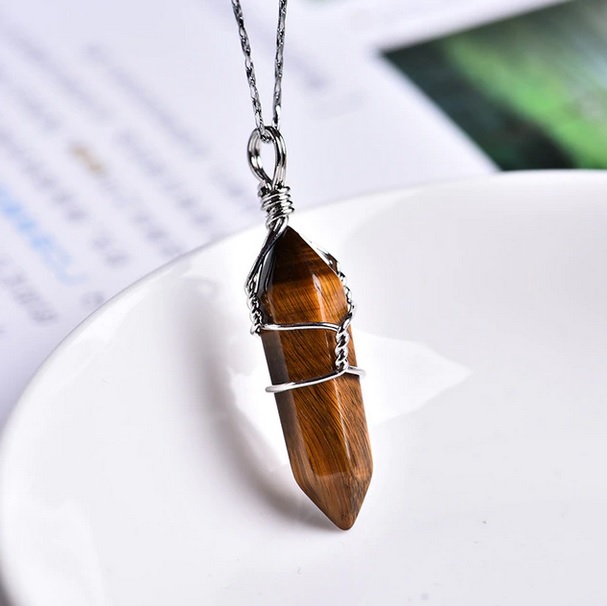 Krásný přívěsek na krk s drahokamem (tygří oko). Tento přívěsek dodá Vašemu outfitu ten správný šmrnc. Jedná se vzácný kámen, který je uchycen a navlečen na nerezový řetízek s karabinkou. Velmi hezké a stylové zpracování.