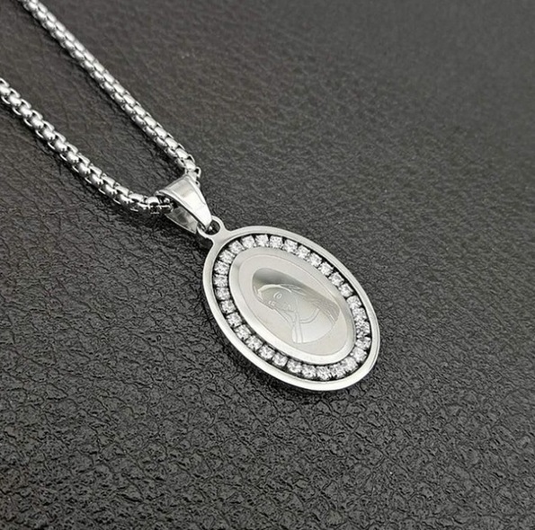 Velmi hezký přívěsek na krk vykládaný zirkony s panenkou Marií na zlatém řetízku. Panna Maria je matkou Ježíše Nazaretského a je uctívána v křesťanství, kde je většinou církví označována jako Bohorodička. Vyrobene z kvalitního materiálu a pozlaceno. Pro spolehlivé nošení je použito bezpečné zapínání na karabinku. Nedoporučujeme koupání v chlorované vodě.