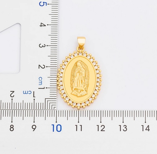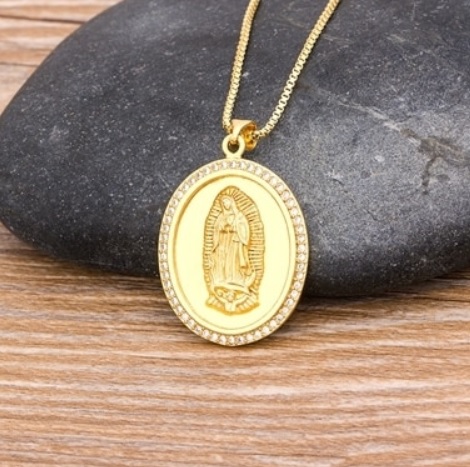 Velmi hezký přívěsek na krk vykládaný zirkony s panenkou Marií na zlatém řetízku. Panna Maria je matkou Ježíše Nazaretského a je uctívána v křesťanství, kde je většinou církví označována jako Bohorodička. Vyrobene z kvalitního materiálu a pozlaceno. Pro spolehlivé nošení je použito bezpečné zapínání na karabinku. Nedoporučujeme koupání v chlorované vodě.