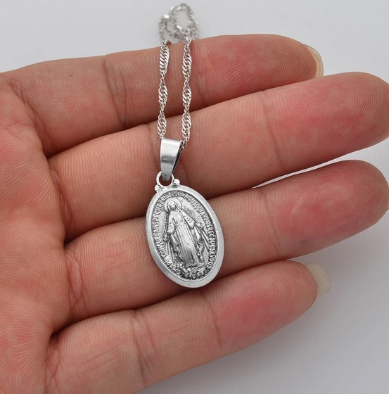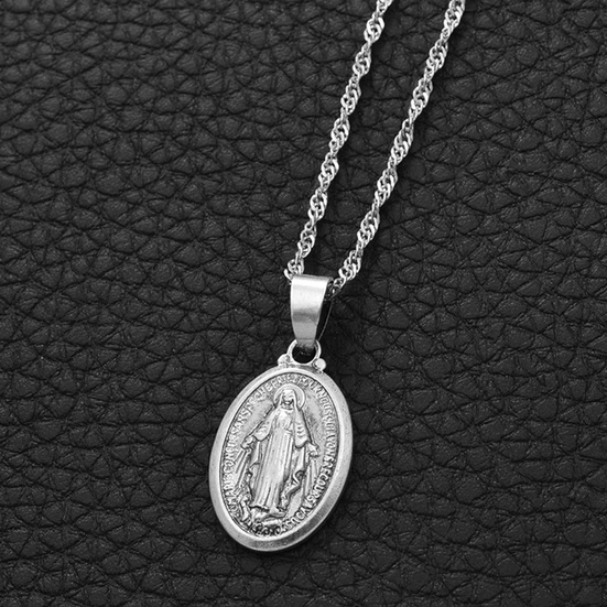 Velmi hezký přívěsek na krk s panenkou Marií na stříbrném řetízku. Panna Maria je matkou Ježíše Nazaretského a je uctívána v křesťanství, kde je většinou církví označována jako Bohorodička. Vyrobene z kvalitního materiálu. Pro spolehlivé nošení je použito bezpečné zapínání na karabinku. Nedoporučujeme koupání v chlorované vodě.