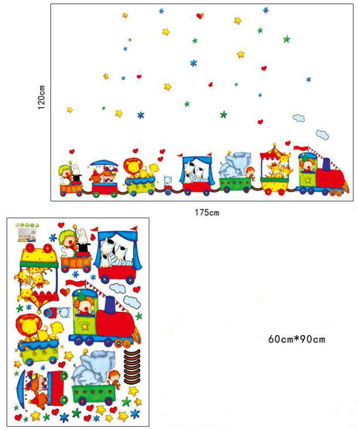 Krásná dětská samolepka cirkusový vláček plný zvířátek na zeď, která rozzáří každý dětský pokoj. Vyrobeno z kvalitního a nezávadného materiálu. Samolepka obsahuje vláček s mnoha zvířátky včetně dekorace, mráčků, hvězdiček atd. Samolepka je vhodná jak na zeď, tak na jiné typy povrchů (nábytek, obklady, sklo apod.) Uvidíte, že si Vaše ratolesti tuto kouzelnou dekoraci zamilují! Aplikace je velmi jednoduchá.