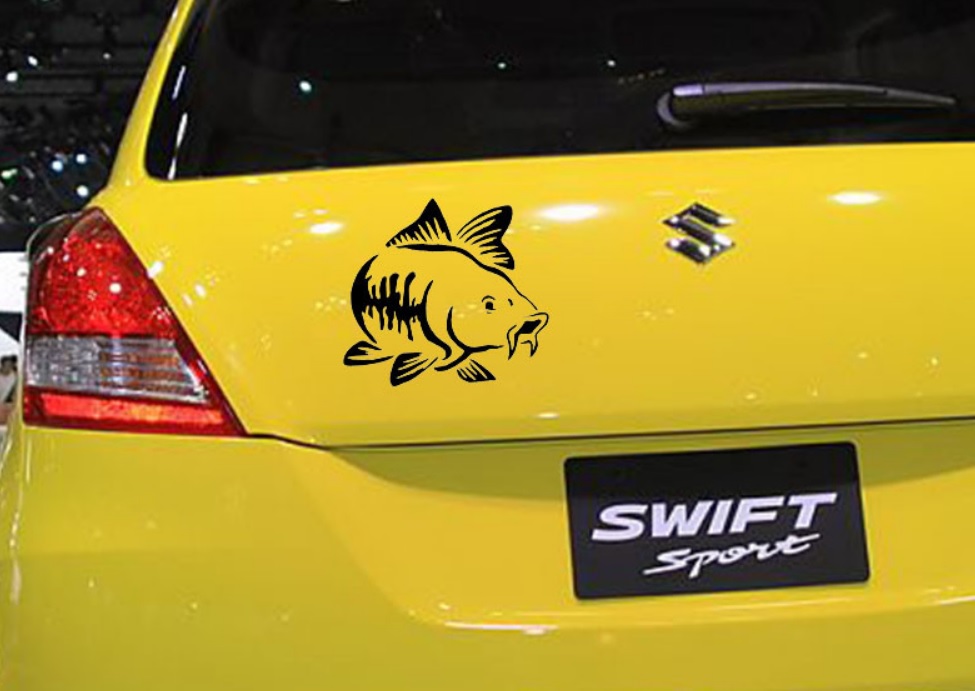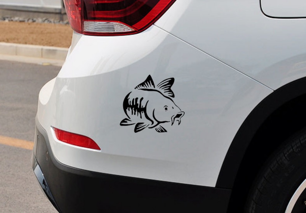 Samolepka na automobil kapr. Tato samolepka je vhodná pro rybáře a všechny co milují ryby. Samolepku dodáváme v bíle a černé barvě o velikosti 20x15 cm. Vaše auto bude vypadat skvěle s tímto kapříkem.