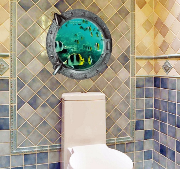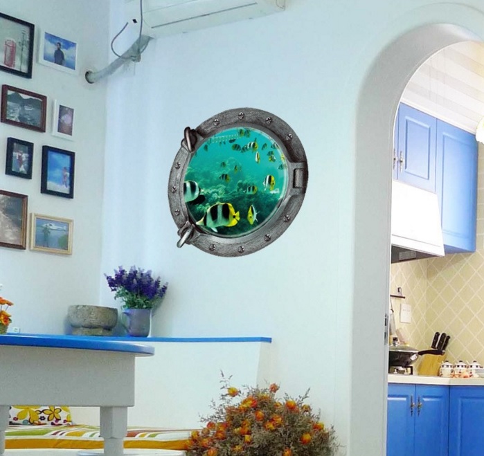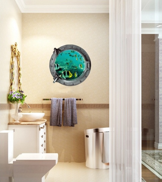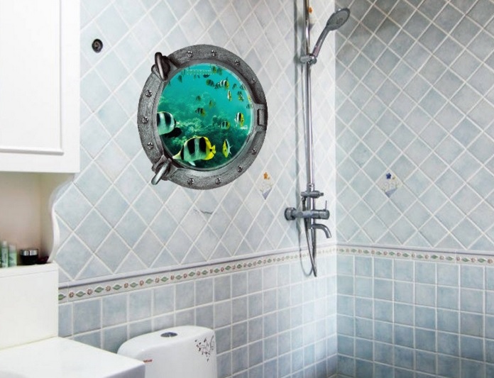 Velmi nápadité pojetí samolepky na zeď, která ztvárňuje pohled pod hladinu moře. Z okénka je výhled na mořské živočichy v reálném vyobrazení. Samolepka je vhodná téměř kamkoliv. Ale její krása nejvíce vynikne v koupelně nebo na toaletě.