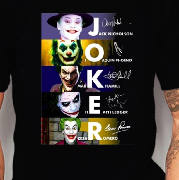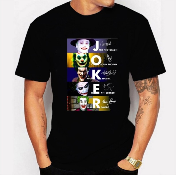 Pánské stylové tričko J.O.K.E.R sestaveno z písmen jmen všech Jokeru z filmů Batman. Kdo by neznal klauna, úhlavního nepřítele batmana. Tričko zaujme již na první pohled a to díky skvěle vytvořenému potisku. Další skvělý kousek, který musíte mít.