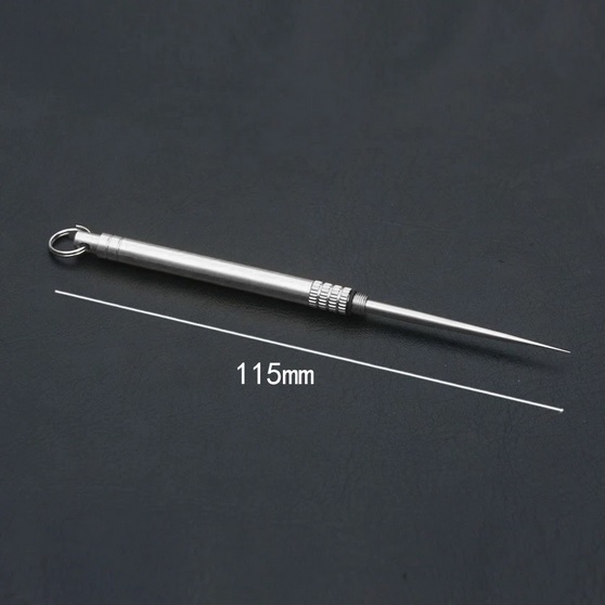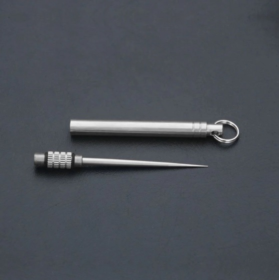 Všestranná EDC titanová jehla, která se hodí při mnoha činnostech a dokáže vyřešit několik problémů. Velmi lehká, skladná, odolná a pevná. Jehlu složíte ze dvou kusů sešroubováním do sebe. Z jehli se tak stane ostrý a bodný nástroj. Je potřeba vytáhnout třísku, něco propíchnout, otevřít či rozříznout, tak s tím Vám pomůže tohle skvělé EDC.
