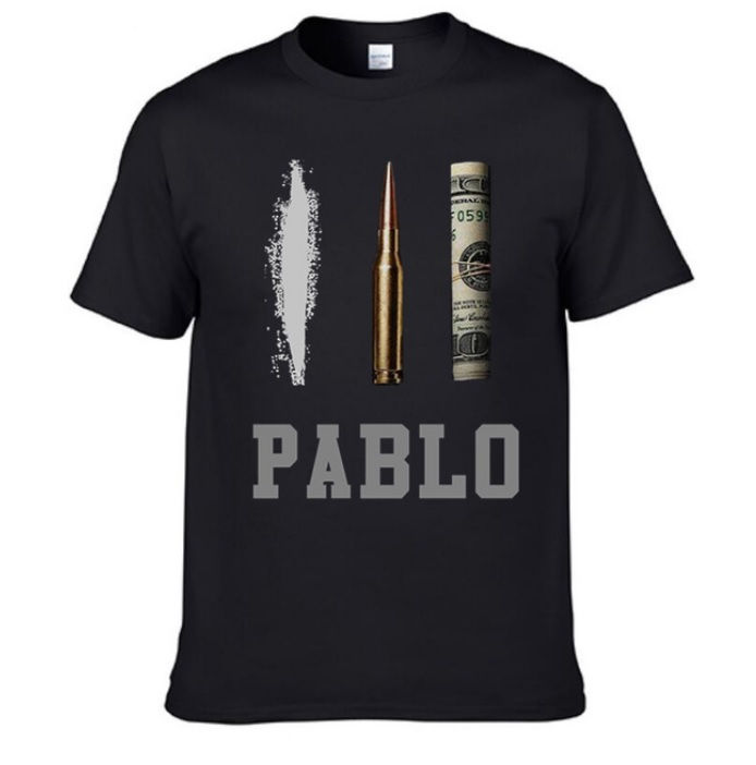 Panské stylové tričko černé barvy s kvalitním potiskem Pablo. Pablo Escobar, tento velikán byl svého času sedmý nejbohatší muž světa. To, že to nebylo úplně tak čisté bohatství jeho hodnotu nesnižovalo, ale i tak to stálo za to. Nyní nabízeme toto kvalitní a stylové tričko s potiskem symbolů Pabla Escobara. Určitě obohatí Váš šatník a stane se oblíbeným tričkem.