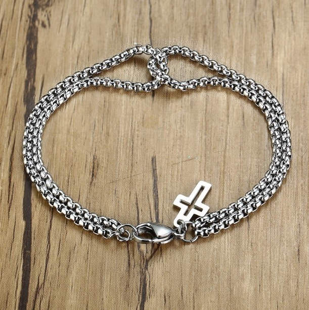 Náramek vyrobený z nerezové oceli doplněný křížkem. Tento náramek podtrhne Váš styl a stane se hezkým doplněk Vašeho zápěstí. Velmi kvalitní zpracování dává tomuto náramku vyjimečný vzhled. Jednoduché zapínání na karabinku.
