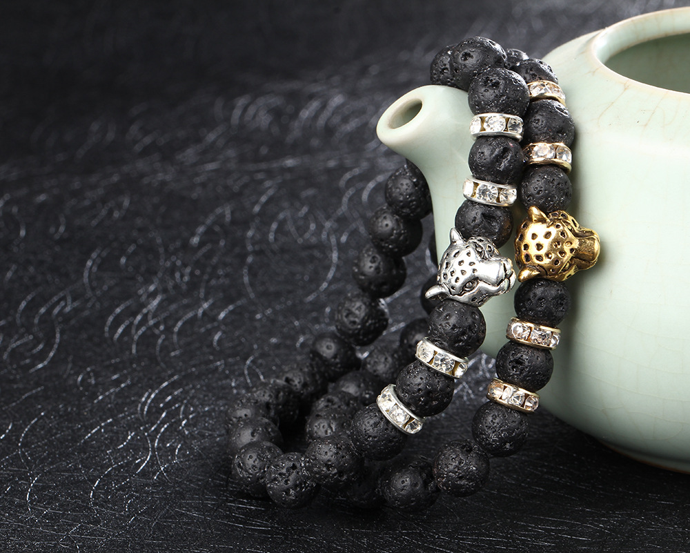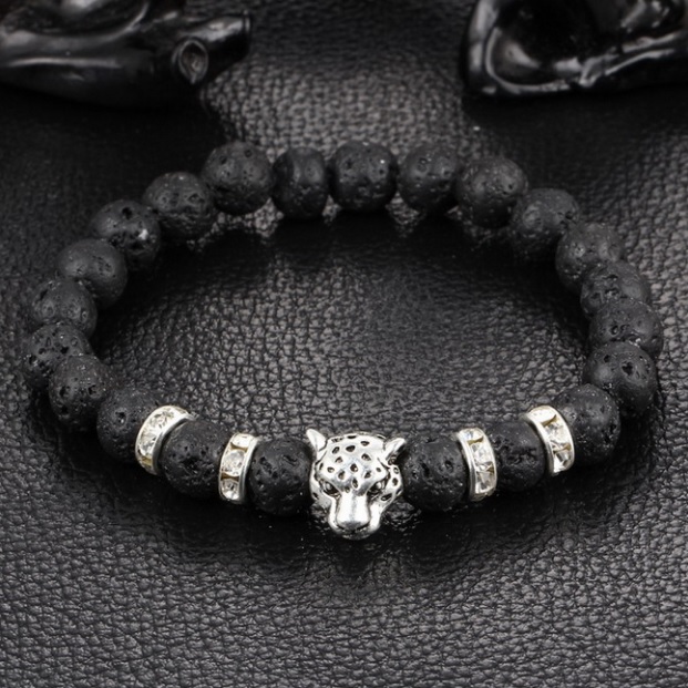 Nádherný stylový náramek, který se stane Vašim velmi oblíbeným modním doplňkem. Náramek je vyroben z kamenných korálků, korálky jsou ručně broušeny a každý náramek je tak jedinečný. Náramek je zdoben stříbrnou tygří hlavou a stříbrnými kroužky, které jsou vykladané třpitivými kamínky.
