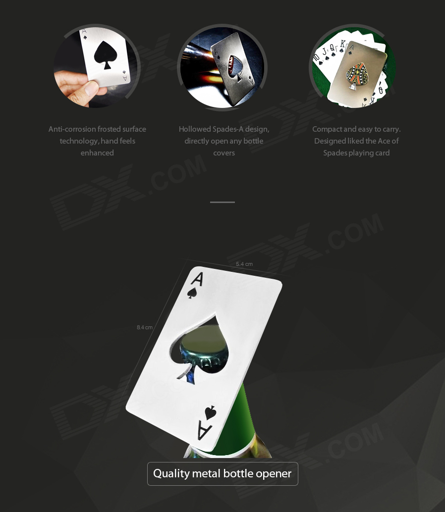 Cool otvírák na lahve ve tvaru pikového esa. Otvírák je vyroben z leštěné nerezy, velmi odolný a stylový. Tato bezva věc, si určitě najde místo ve Vaší domácnosti.