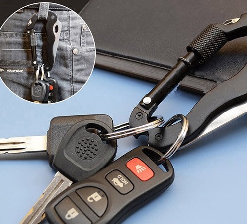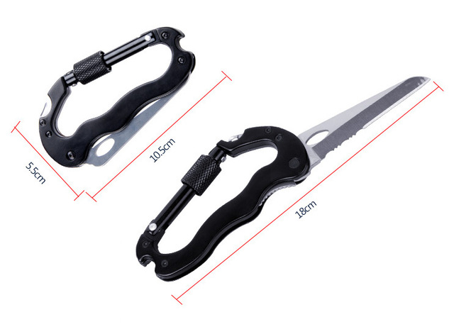 Šroubovací multifuknční karabina vyrobena z hliníkové slitiny eloxovaná (ochrana před oxidací). Karabina je spolehlivý spojovací prvek, díky kterému již nikdy nic neztratíte, a k tomu je vybavena pěti užitečnými doplňky. Vhodná jak na turistiku, camping, a další outdoorové aktivity. Velmi užitečný doplňěk k Vašemu batohu, tašce, klíčím apod. Všechny součásti jsou vyrobeny z nerezové oceli.