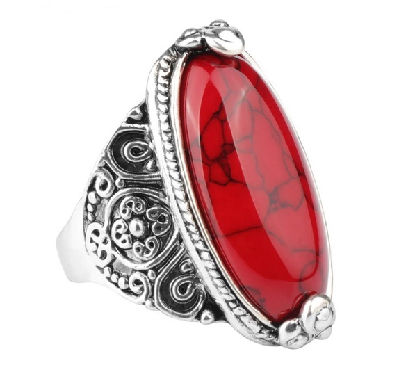 Mohutný dámský prsten zdobený červeným tyrkysem. Prsten je z vrchu dekorován velkým tyrkysem a jeho strany jsou zdobeny. Tento stylový prsten se hodí pro všechny příložitosti a stane se Vašim oblíbeným doplňkem k Vašemu outfitu. Tyrkys je nejúčinnější léčivý krystal. Přináší zotavení ducha i pohodu těla. Jedná se o ochranný kámen používaný od nepaměti na amulety. Povrchová úprava je antické stříbro.