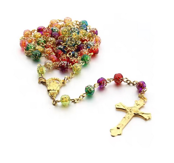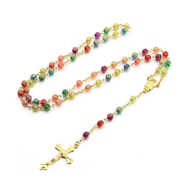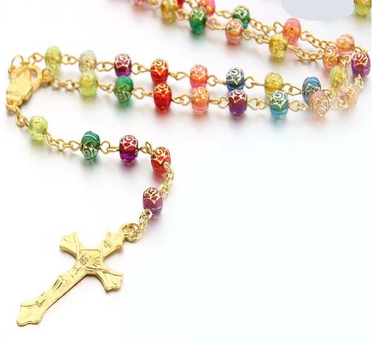 Velmi pěkný růženec v barevném provedení, který se hodí nejen do auta na zrcátko, ale i na krk, ruku, či jako ozdoba domova apod. Růženec obsahuje křížek zlaté barvy a panenku Marii. Původ růžence jako modlitebního počítadla je raně středověkého původu.