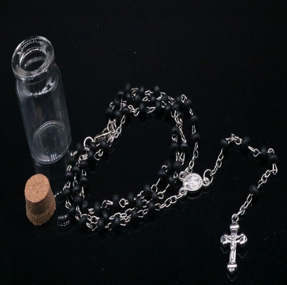 Velmi pěkný růženec v dárkové skleničce s korkovým špuntem. Tento růženec se hodí nejen do auta na zrcátko, ale i na krk, ruku, či jako ozdoba domova apod. Růženec obsahuje křížek stříbrné barvy a medajlonek s panenkou Marii. Jednoduché zapínání pomocí karabinky. Růženec je vyrobený z práveho růžového dřeva s krásnou vůní. Původ růžence jako modlitebního počítadla je raně středověkého původu.
