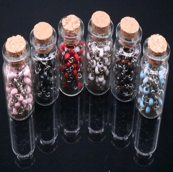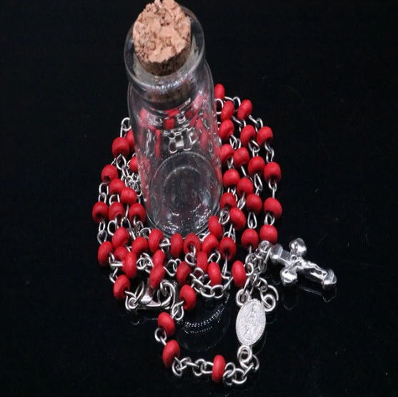 Velmi pěkný růženec v dárkové skleničce s korkovým špuntem. Tento růženec se hodí nejen do auta na zrcátko, ale i na krk, ruku, či jako ozdoba domova apod. Růženec obsahuje křížek stříbrné barvy a medajlonek s panenkou Marii. Jednoduché zapínání pomocí karabinky. Růženec je vyrobený z práveho růžového dřeva s krásnou vůní. Původ růžence jako modlitebního počítadla je raně středověkého původu.