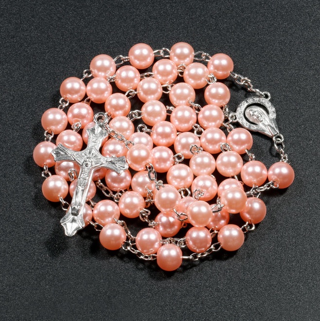 Velmi pěkný růženec v růžové barvě, který se hodí nejen do auta na zrcátko, ale i na krk, ruku, či jako ozdoba domova apod. Růženec obsahuje křížek stříbrné barvy a panenku Marii. Původ růžence jako modlitebního počítadla je raně středověkého původu.